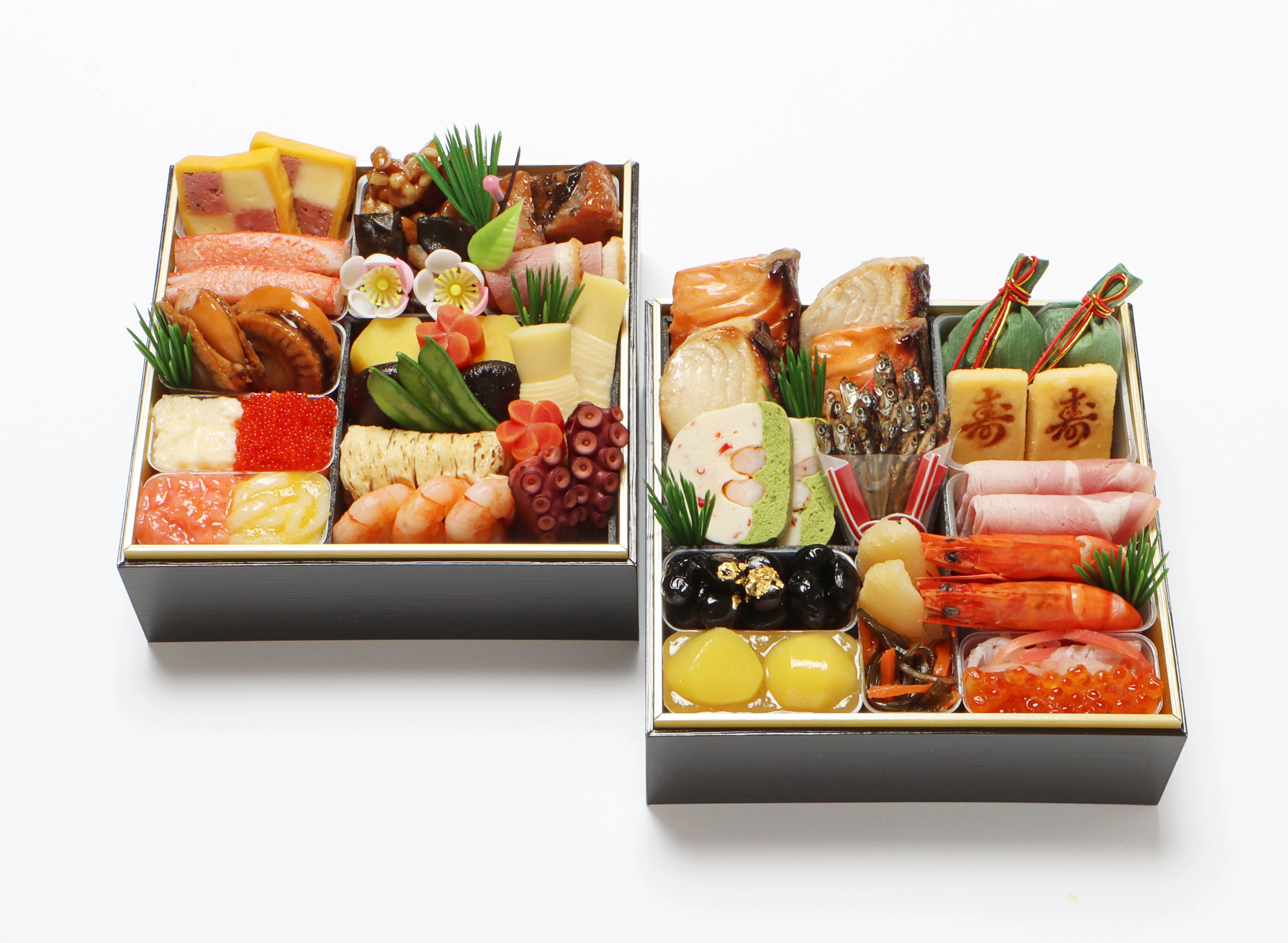 一の重14品目:海老艶煮 鮭柚庵焼 鰆柚庵焼 寿厚焼き玉子 祝い数の子 松前漬 栗きんとん 福豆葡萄煮(金箔)海老とアスパラのテリーヌ ロースハム 京なます いくら 田作り照煮 笹よもぎ餅